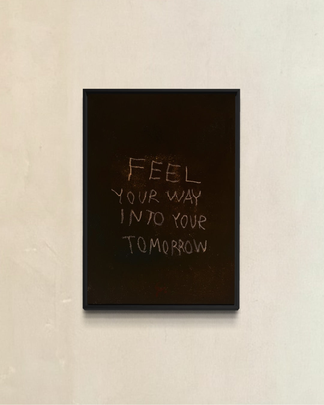 Softly spoken yet unmistakably powerful, FEEL YOUR WAY INTO YOUR TOMORROW is a piece that whispers you forward. Set against a deep, textured backdrop, the hand-scrawled words emerge like a message from the subconscious—an invocation to trust your inner compass, follow sensation over logic, and let emotion guide the path ahead.
