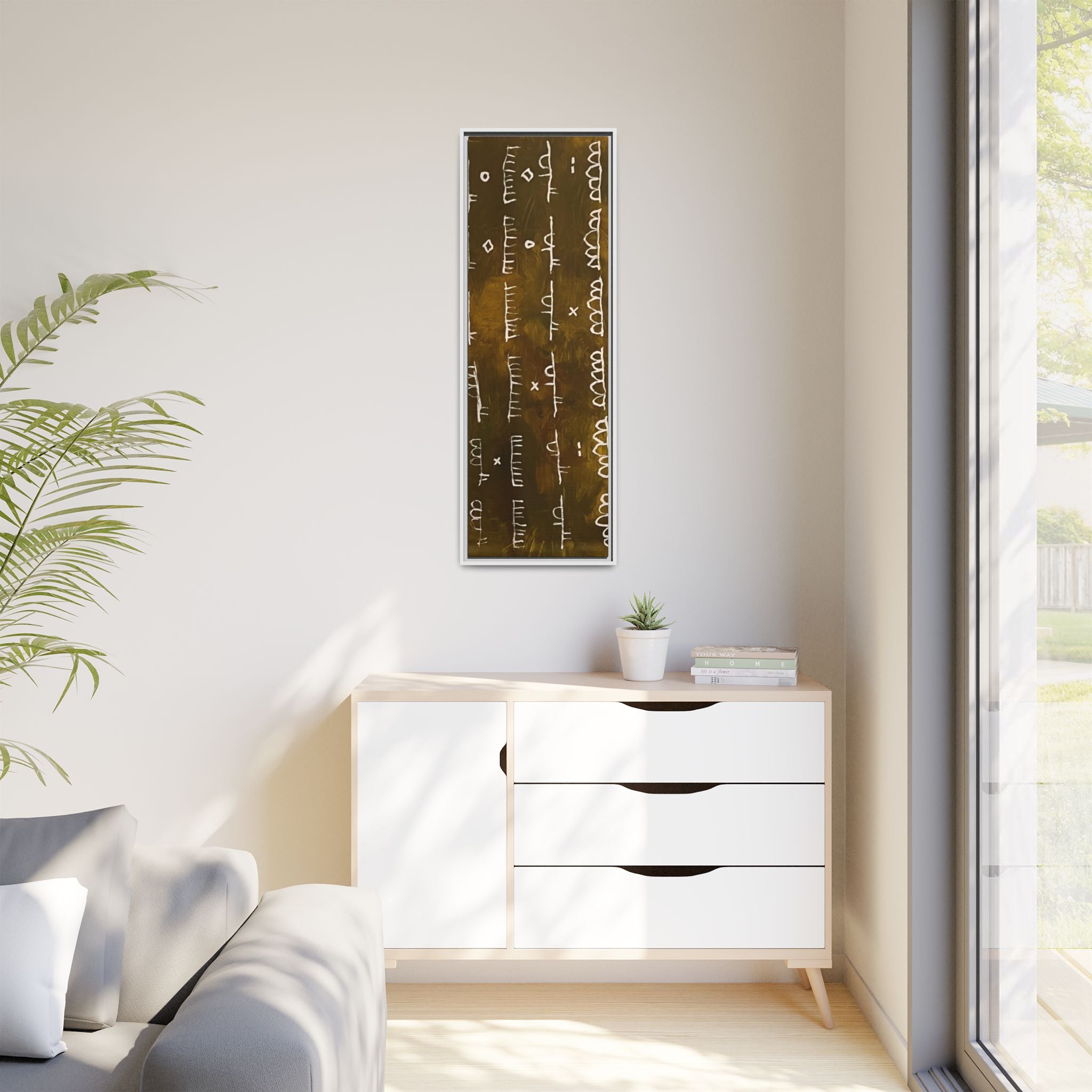 This artwork balances organic imperfection with graphic clarity, offering a grounded yet thought-provoking presence on the wall. It brings a subtle rhythm to modern interiors, anchoring spaces with its raw elegance.