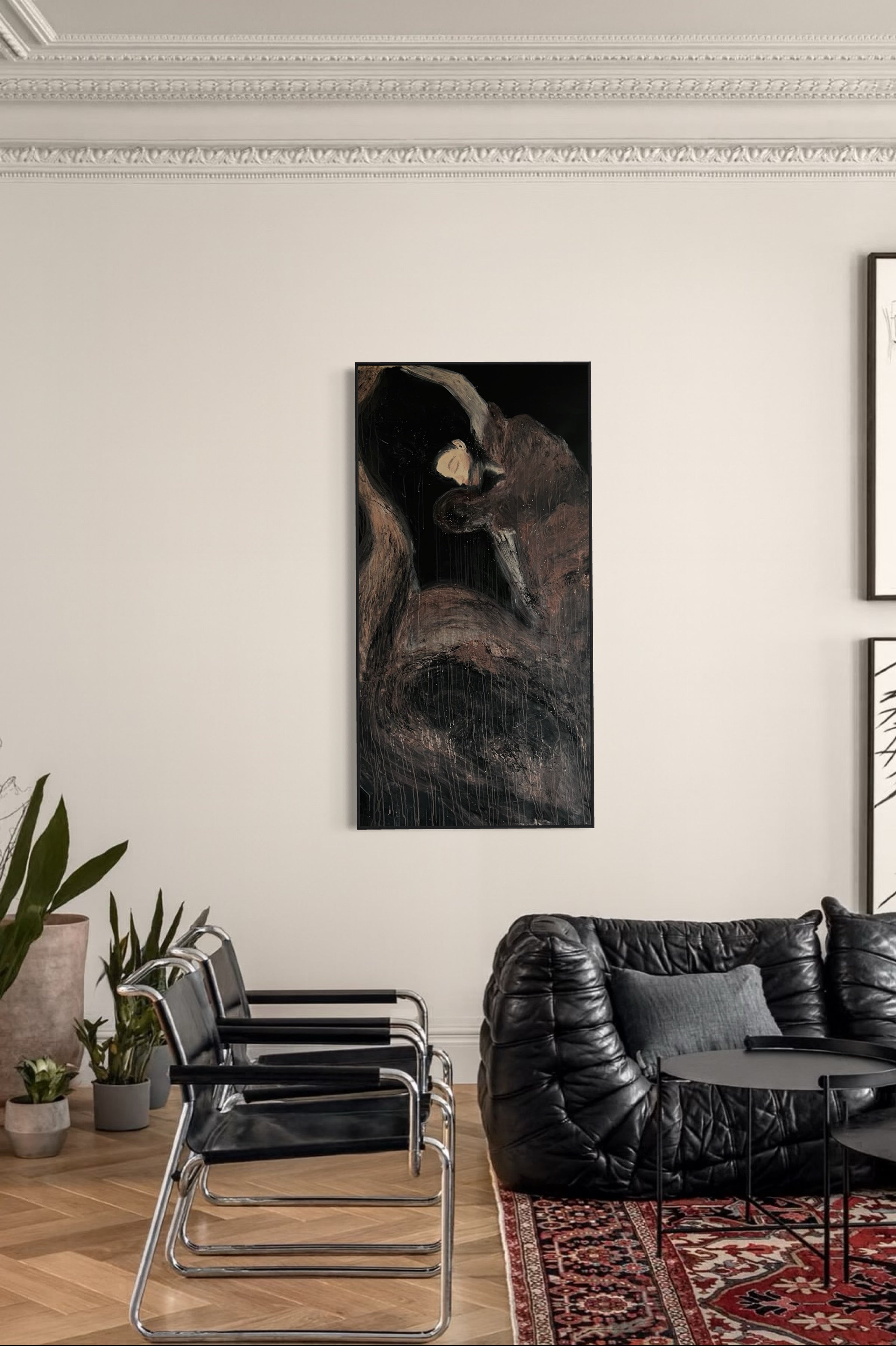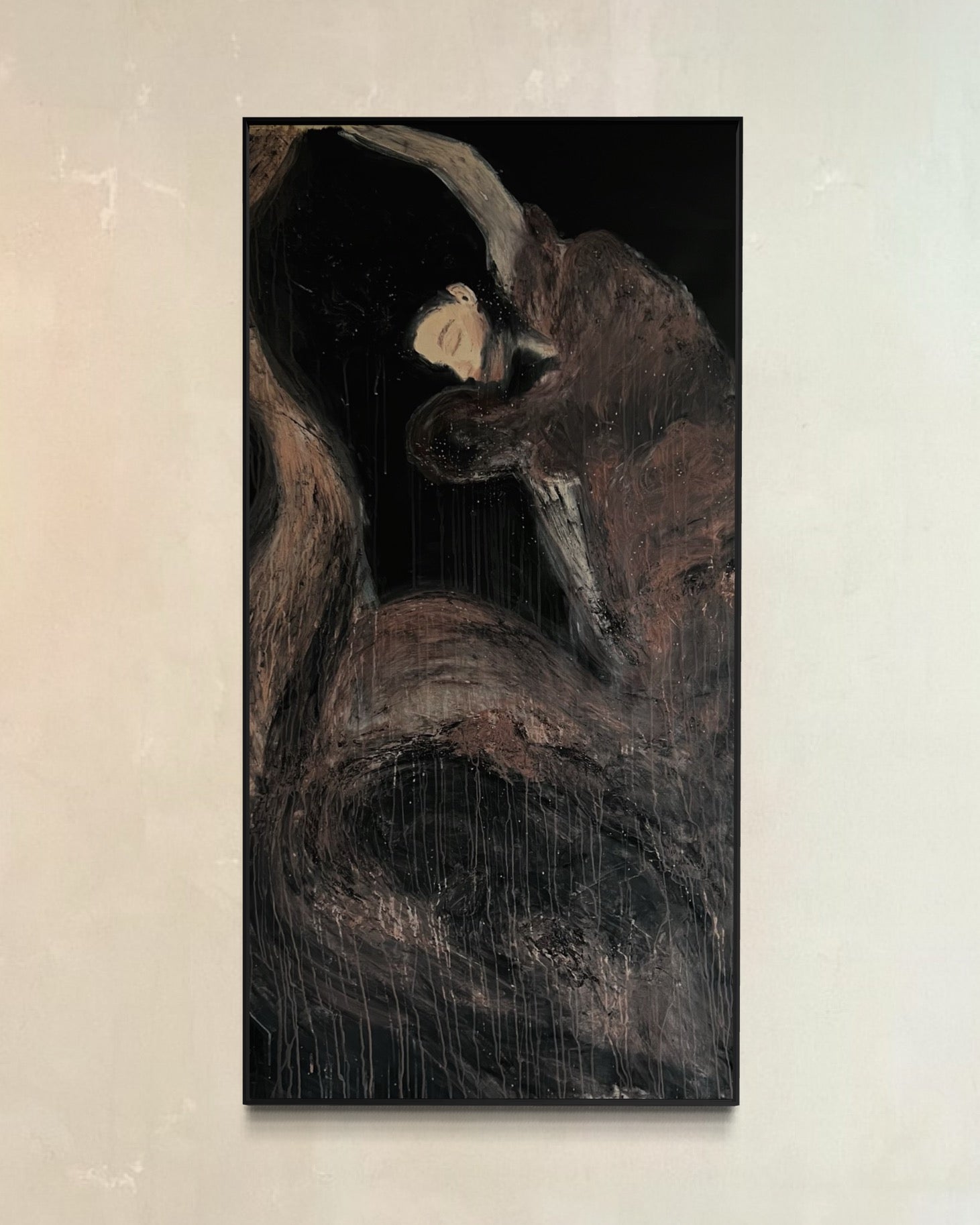 QUEEN OF THE NIGHT is a portrait of feminine power rising from shadow—an ode to the woman who knows her depth, her mystique, and her unshakeable inner throne. Painted in rich, charcoal-dark hues with warm, earthen strokes, the piece captures the moment a figure emerges from the night not diminished by darkness, but defined by it.